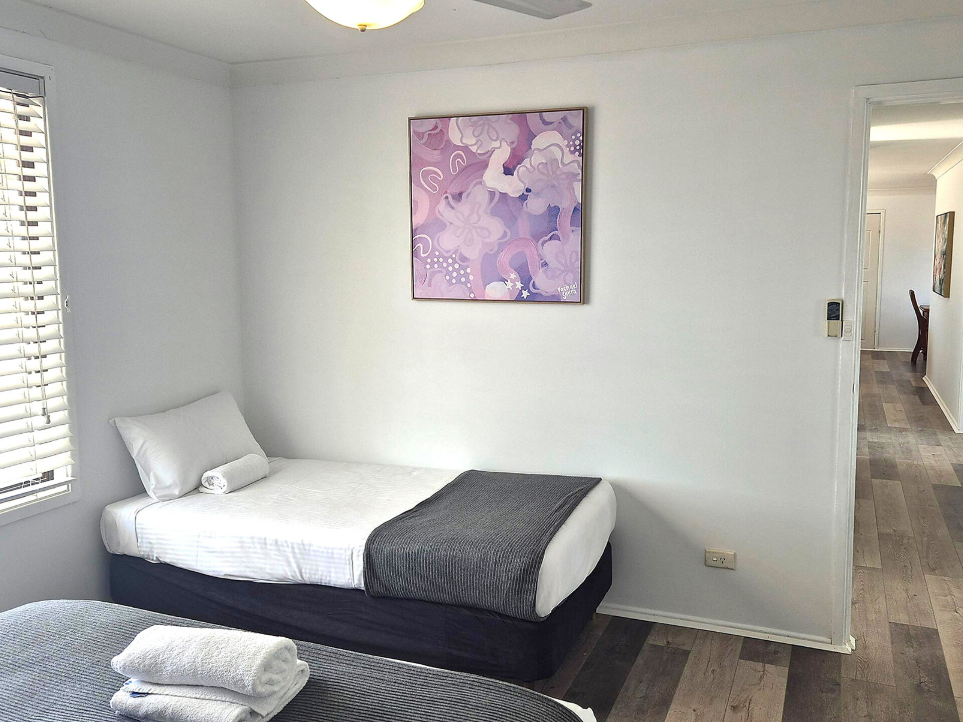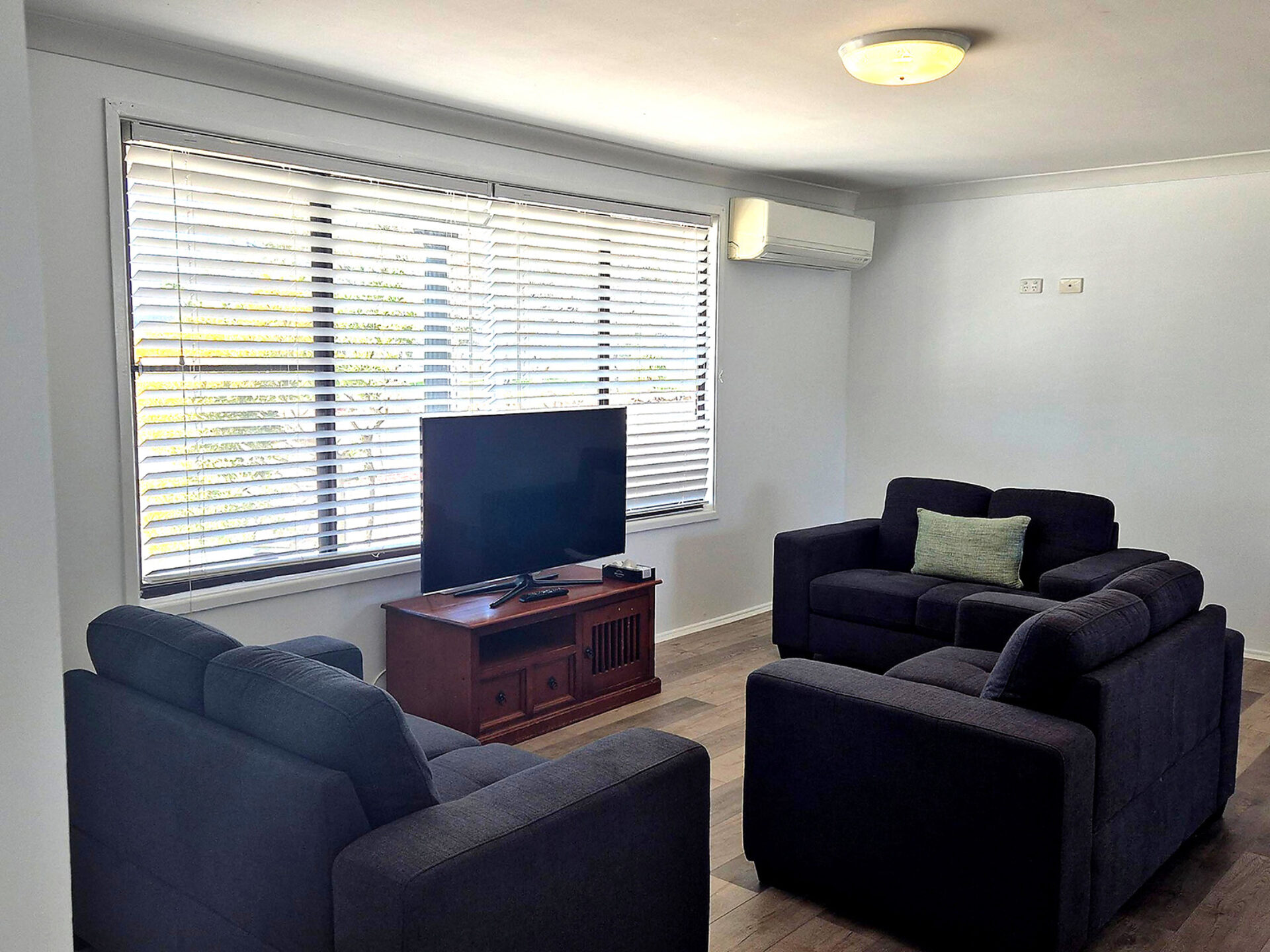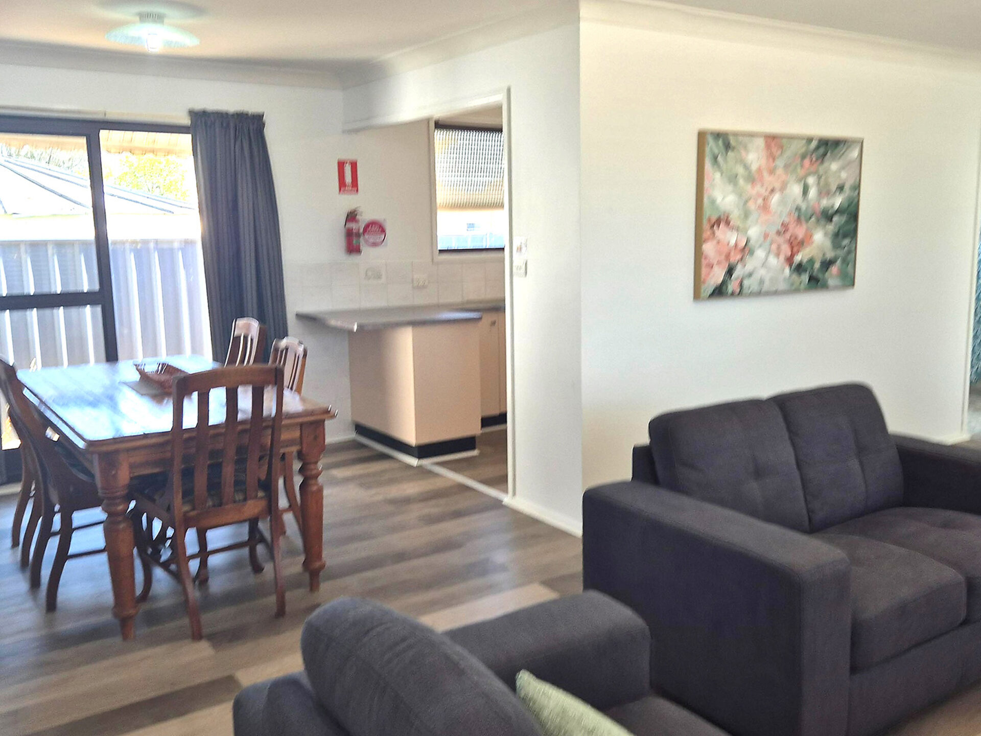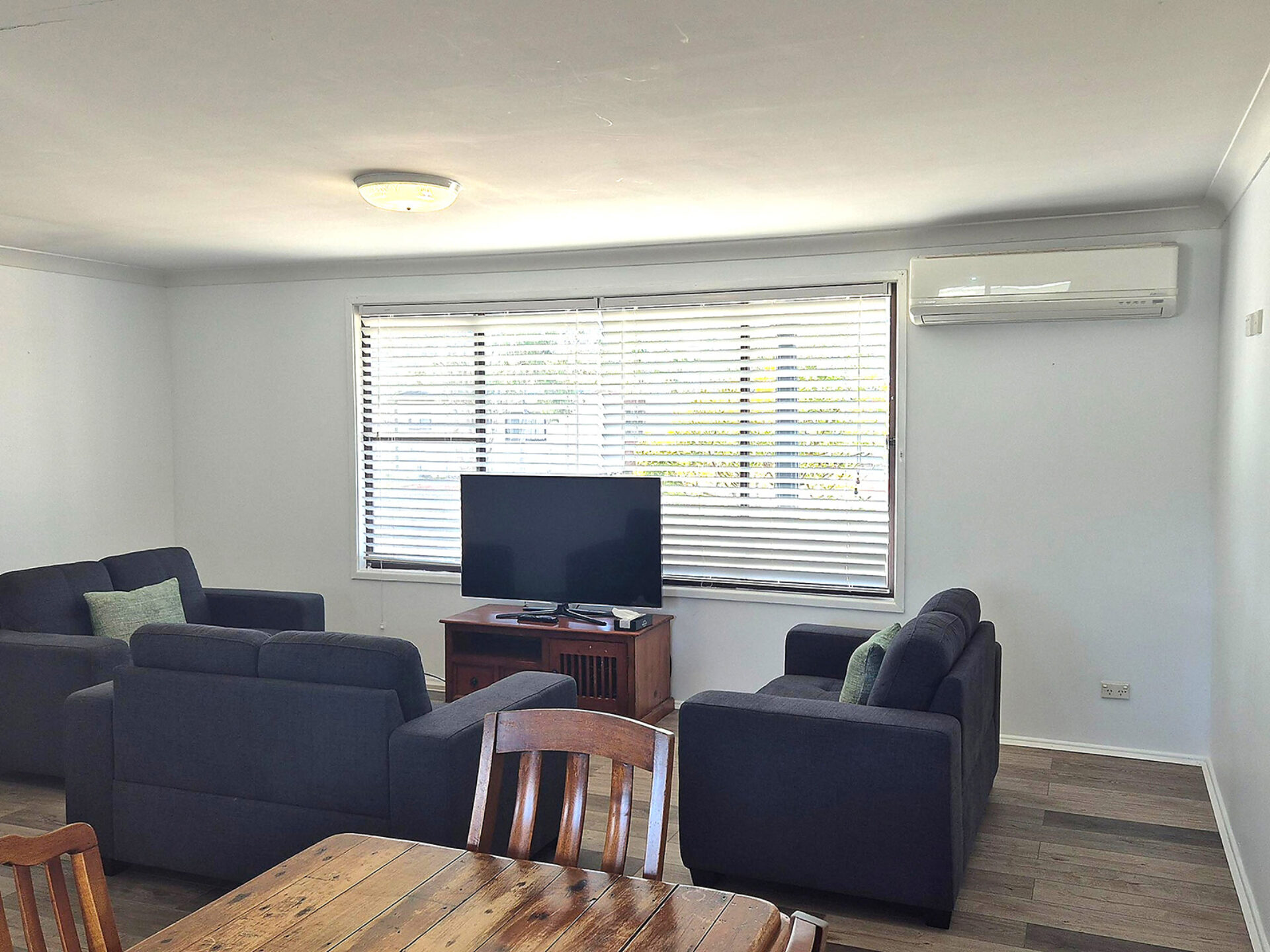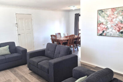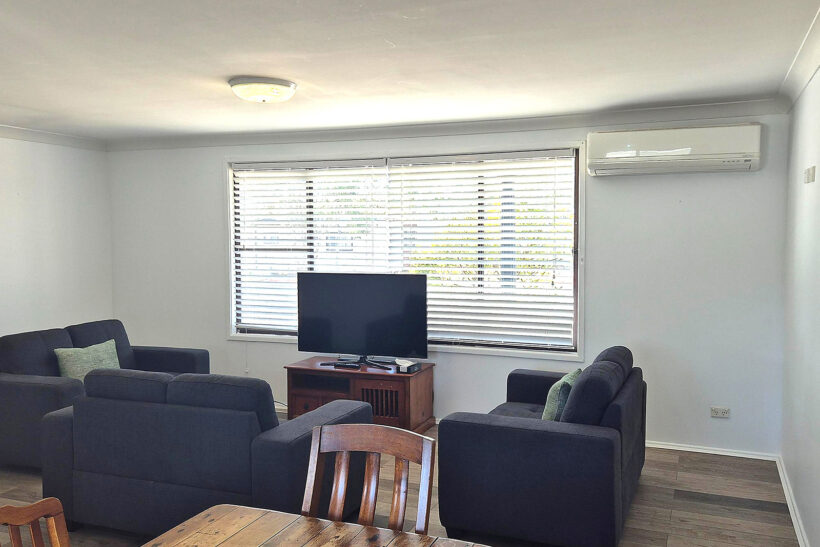 Ideal for larger families or groups, this three-bedroom house sleeps up to eight guests with one queen beds, two double beds, and two single beds. It features a spacious lounge with TV, air-conditioning, dining area, and a full kitchen including electric cooktop, oven, microwave, and full-size fridge. A private bathroom, separate toilet, and in-house laundry add to the convenience.