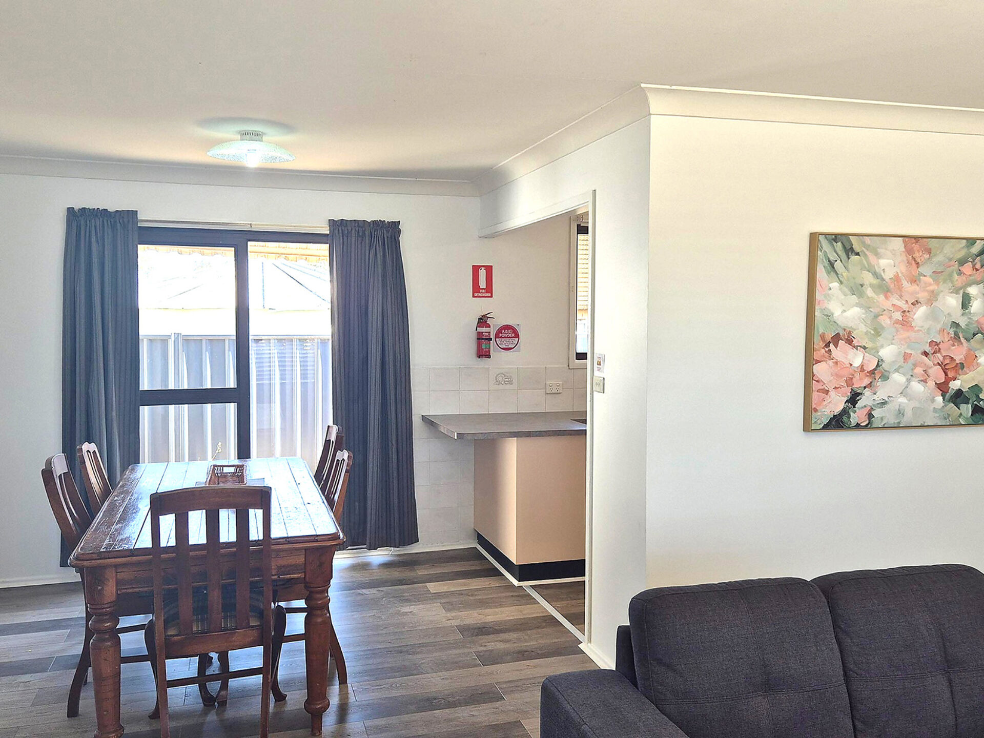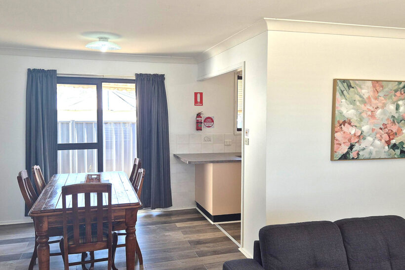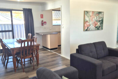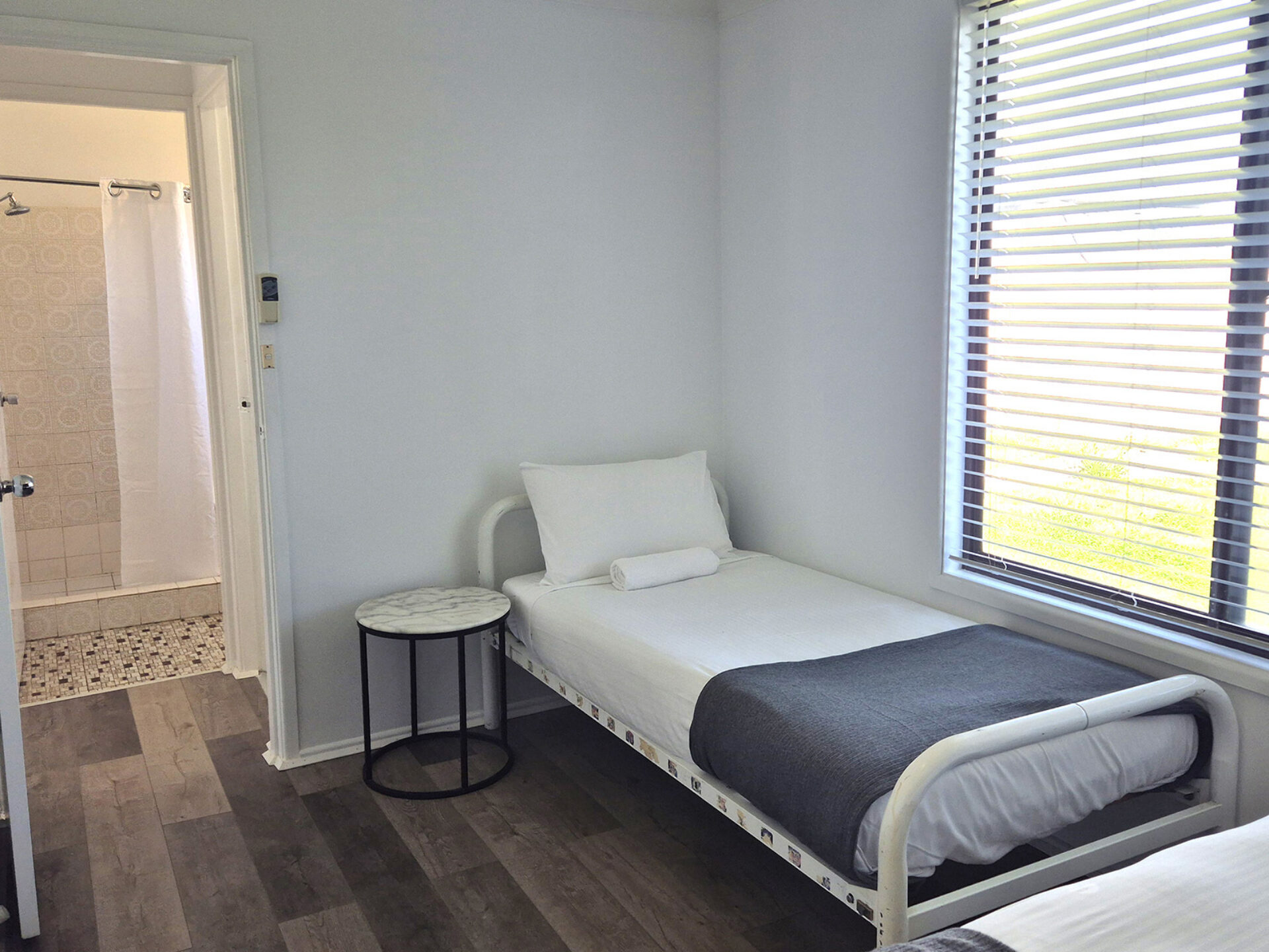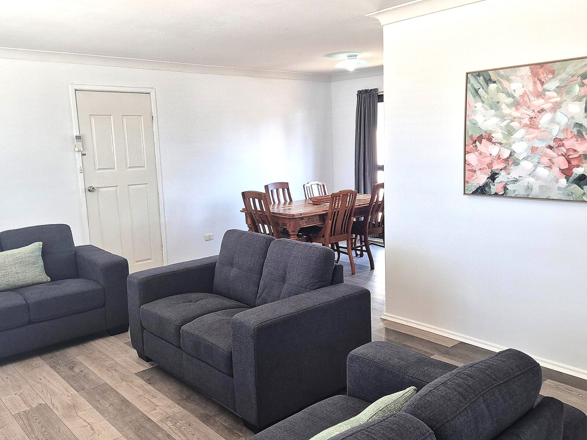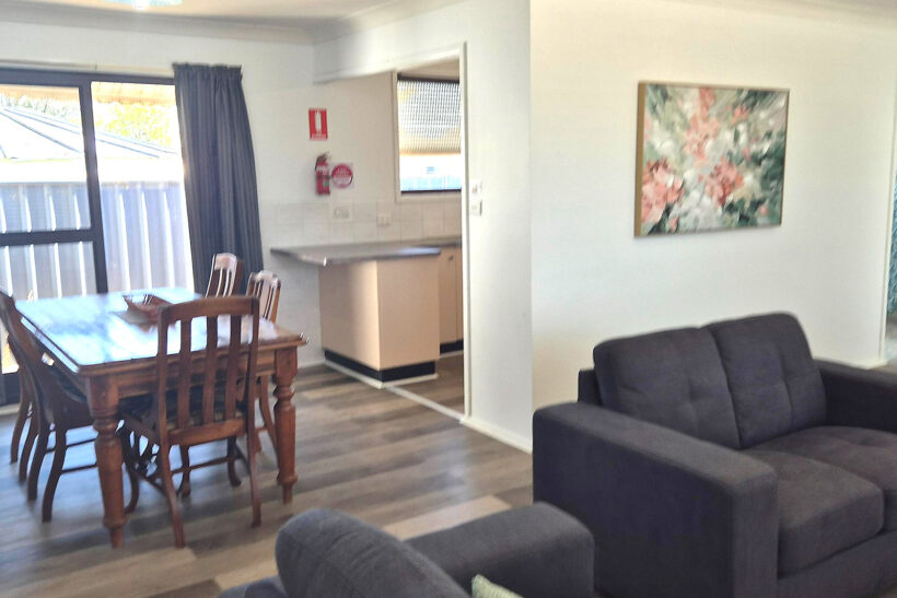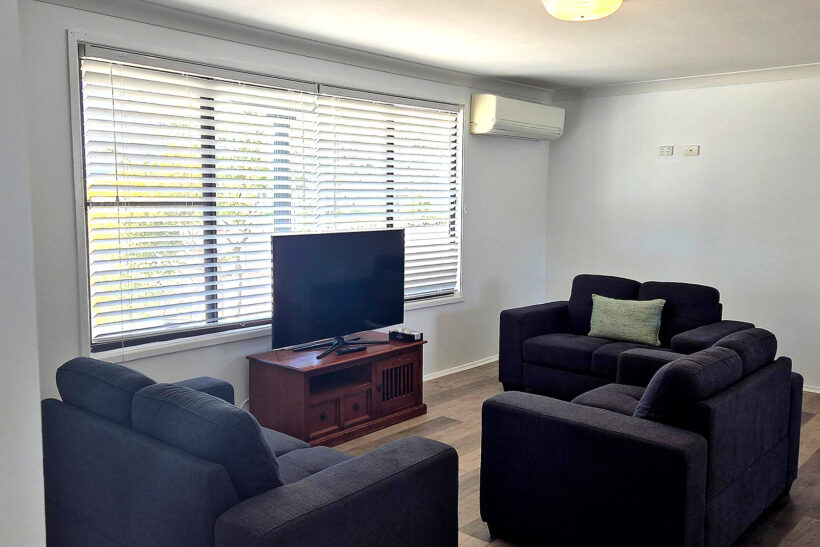 Ideal for larger families or groups, this three-bedroom house sleeps up to eight guests with one queen beds, two double beds, and two single beds. It features a spacious lounge with TV, air-conditioning, dining area, and a full kitchen including electric cooktop, oven, microwave, and full-size fridge. A private bathroom, separate toilet, and in-house laundry add to the convenience.