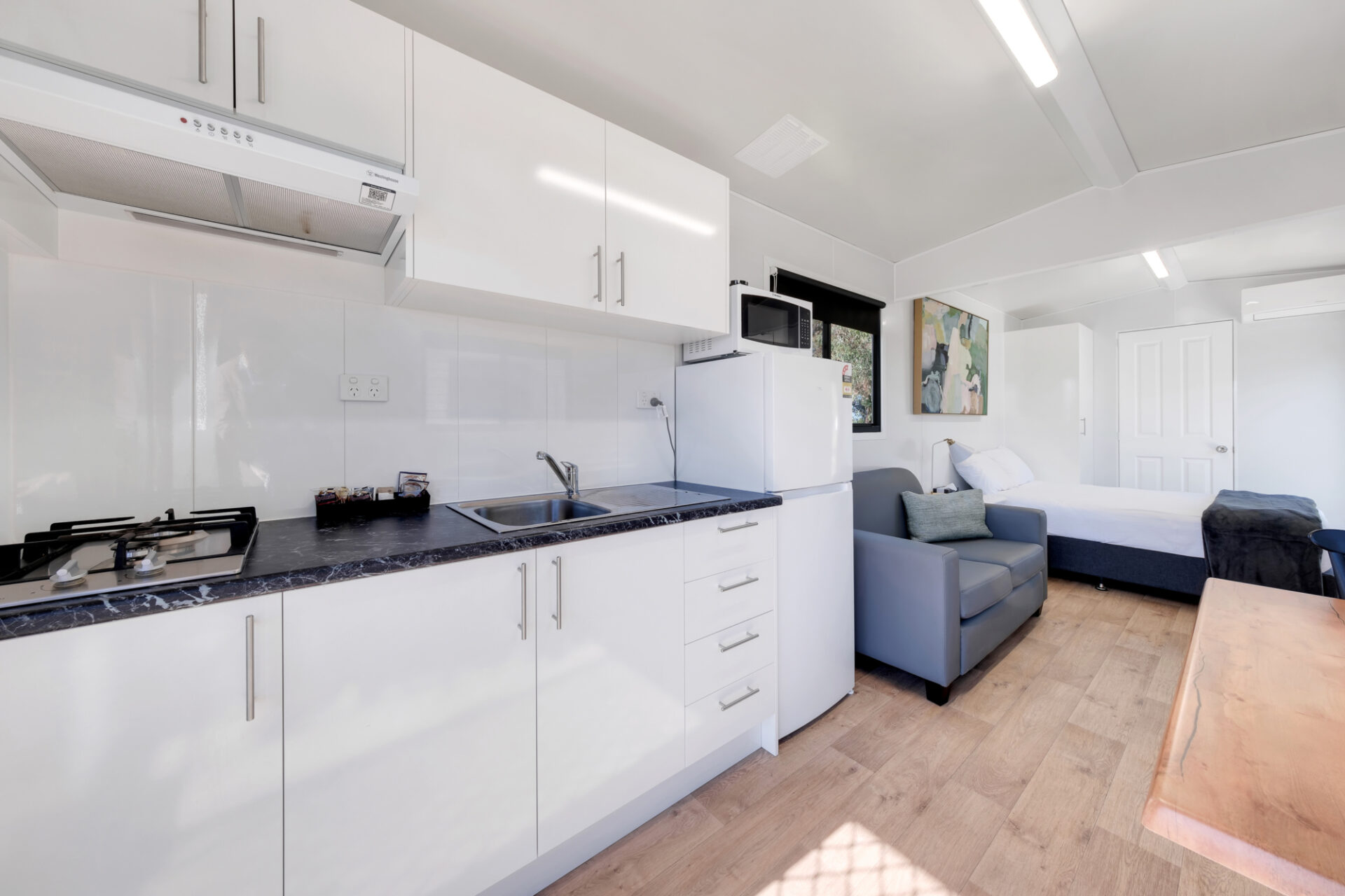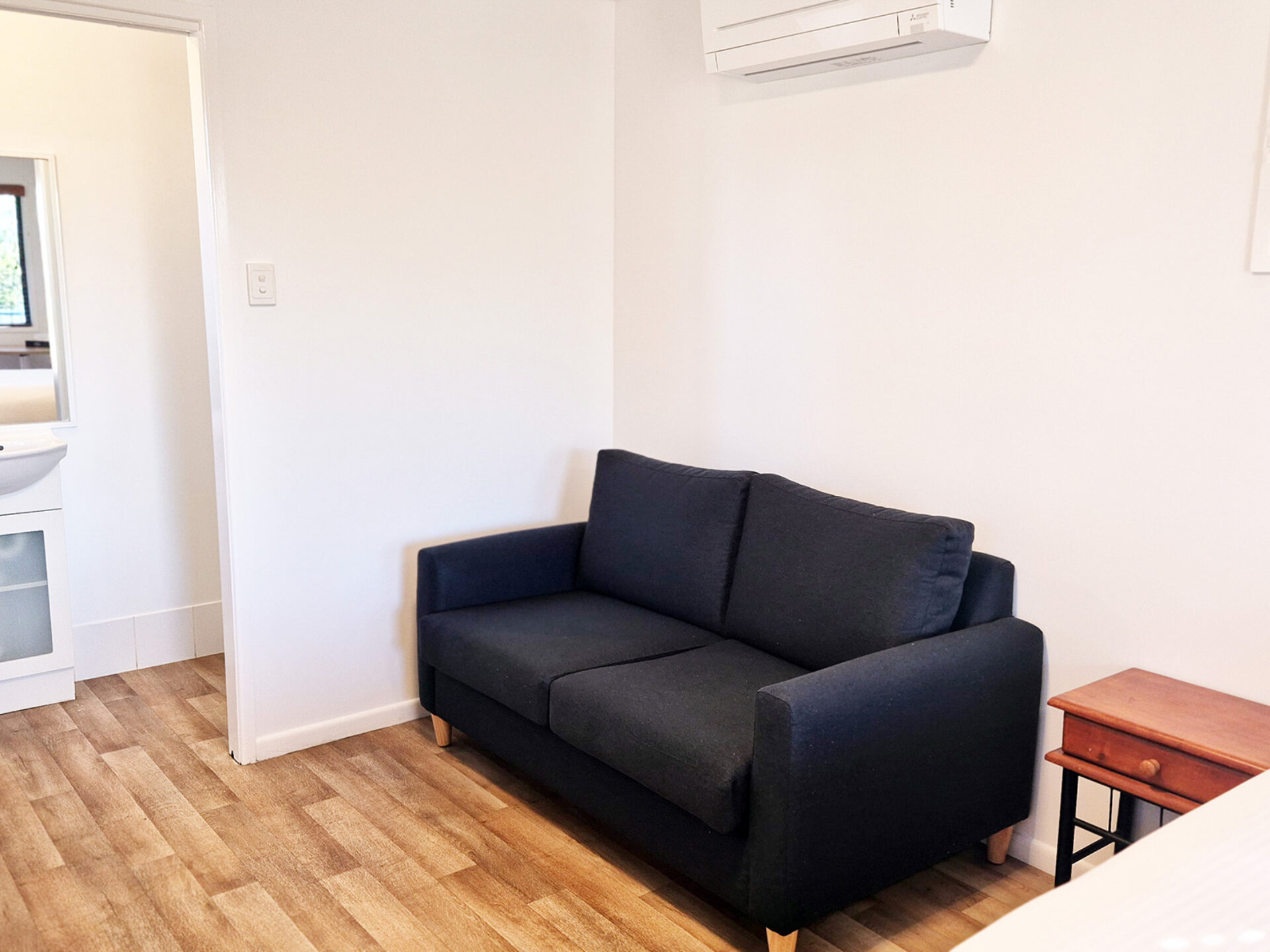 This open-plan studio sleeps up to two guests with a queen bed, private bathroom, and reverse cycle air-conditioning. The kitchenette is equipped with an electric cooktop, microwave, toaster, and full-size fridge. Relax indoors with a TV or step outside to enjoy the mountain views from the front patio with outdoor seating.