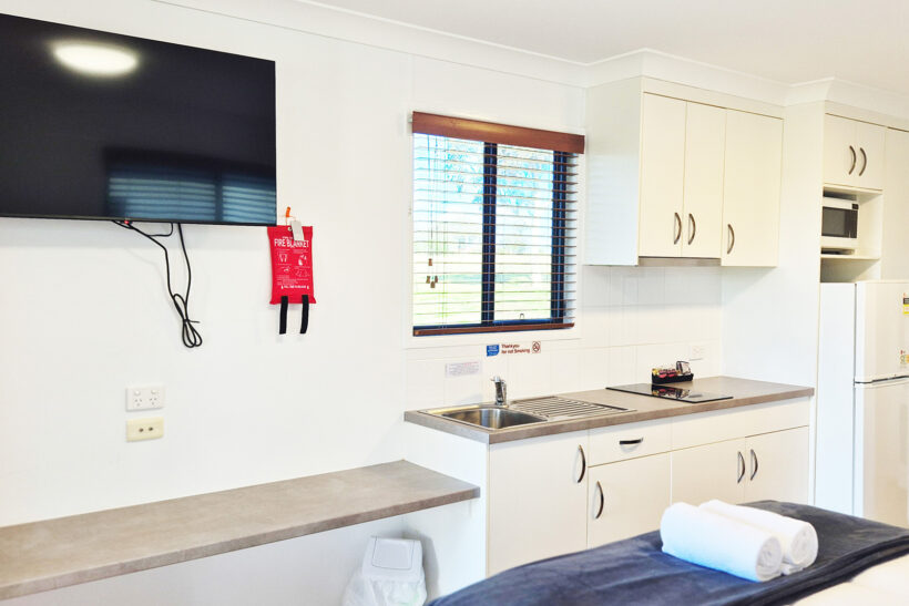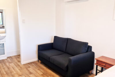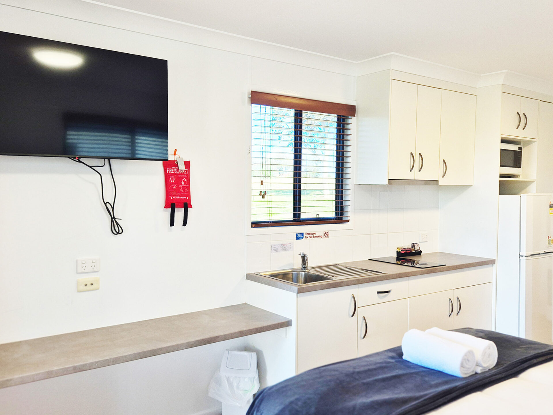 This compact studio is ideal for singles or couples, sleeping up to two guests with a double bed. The open-plan layout includes a private bathroom, air-conditioning, and a kitchenette with gas cooktop, microwave, toaster, and full-size fridge. A dining area and TV offer added comfort, making it a convenient base for short or extended stays.